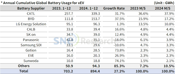 2024年动力电池销量前十依旧被中、韩、日三个国家的企业包揽,中国动力电池厂商有六家入围,宁德时代全球装车量达339.3GWh,同比增长31.7%,市占率进一步增至37.9%,连续8年登顶全球第一;第二名是比亚迪,在全球市场的占有率提升至17.2%。另外,中创新航、国轩高科、亿纬锂能、欣旺达分别位列第四、第八、第九、第十。 这六家中国电池厂商在全球市场的占有率进一步上涨至67.1%,与2023年的63.4%相比,提升了3.7个百分比,其中,市占率在2024年进一步提升的中国动力电池厂商包括宁德时代、比亚迪、国轩高科、欣旺达。 上榜的韩国动力电池厂商包括LG新能源、SK on和三星SDI,三家电池企业2024年在全球市场的占有率为18.5%,与2023年的23.1%相比,下跌了4.6个百分点。 日本动力电池厂商前十名就只有松下一家入榜,市占率从2023年的6.1%下降至2024年的3.9%。 韩、日企2024年市场的丢失与欧美汽车厂商对动力电池的需求下降有关。 韩、日企主要服务于欧洲、美国、韩国汽车厂商,比如三星SDI的电池主要用于宝马,其次是Rivian和奥迪。SK On的电池主要安装在现代汽车集团生产的电动汽车上,其次是梅赛德斯-奔驰、福特和大众。LG新能源的电池主要由特斯拉使用,其次是大众、雪佛兰和福特。松下主要向特斯拉供应电池。 但在去年,欧美等地的电动汽车销量增速放缓,全球电动汽车的销量增长主要依赖中国等市场的增长。中汽协数据显示,2024年,中国新能源汽车产销量分别达1288.8万辆和1286.6万辆,同比分别增长34.4%和35.5%,该增速超过了全球电动汽车销量增速水平。 得益于中国新能源汽车市场的增长,中国动力电池厂商在全球的市占率近年来则是节节攀升。另外,在海外市场,虽然欧美出台了措施加大了对中国动力电池的限制,但业内人士普遍认为,中国在锂电方面发展多年,具有非常完整的产业链,很多终端矿产也都有掌握,欧洲、北美短期内很难完全摆脱对中国产业链的依赖。 而且,中国动力电池正在加快海外建厂的速度,来进一步开拓海外市场。2月11日晚间,宁德时代正式向港交所提交上市申请。宁德时代表示,此次H股上市募集的资金将重点用于海外产能扩张、国际业务拓展及境外营运资金补充,为公司长期国际化战略提供资金支持。申请文件显示,宁德时代目前拟定的H股上市募集资金使用用途包括推进匈牙利项目第一期及第二期建设,总投资额约为49亿欧元。 |